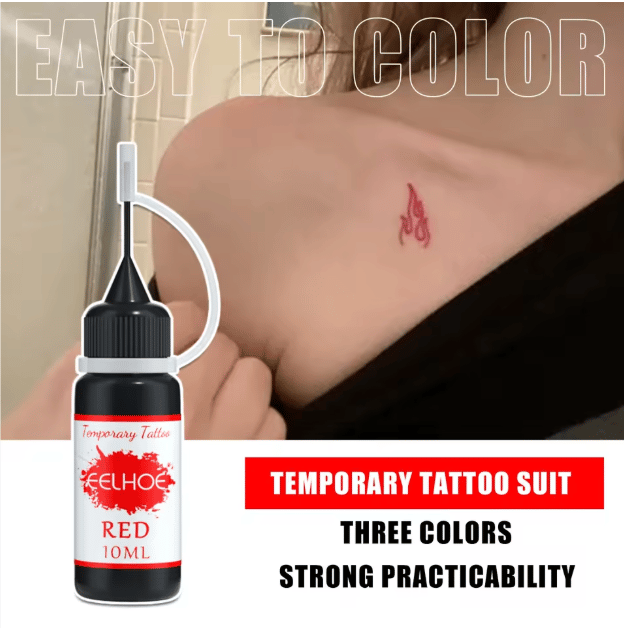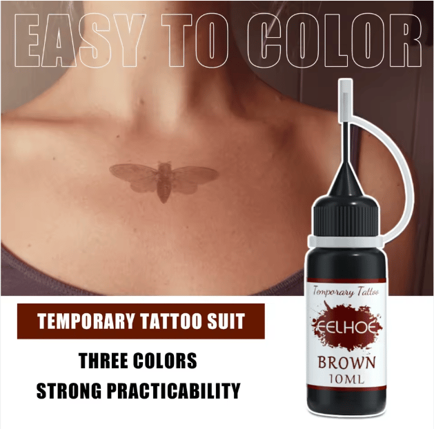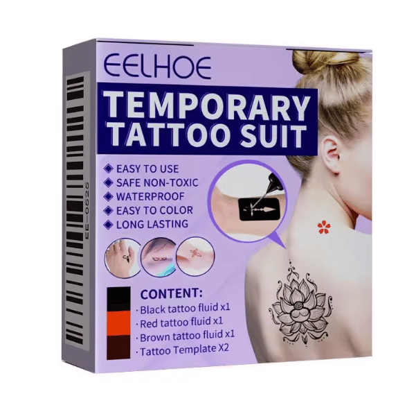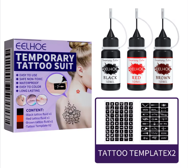 يشمل: سائل تاتو بثلاثة ألوان (أسود، أحمر، بني) + قوالب نقش جاهزة لتسهيل الرسم على الجلد.